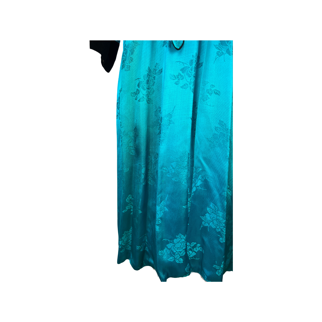 1940's Turqouise Silk Jacquard Robe with Black Velvet Details