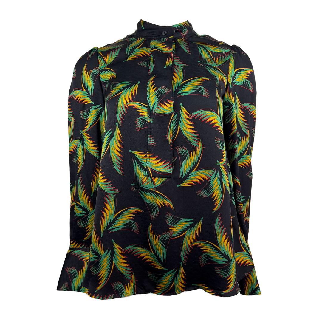 Black, satin blouse with green, yellow and burgundy printed tropical leaves. In new condition. Mandarin collar. Dry Clean Only. Size 0 Is like an XS/S