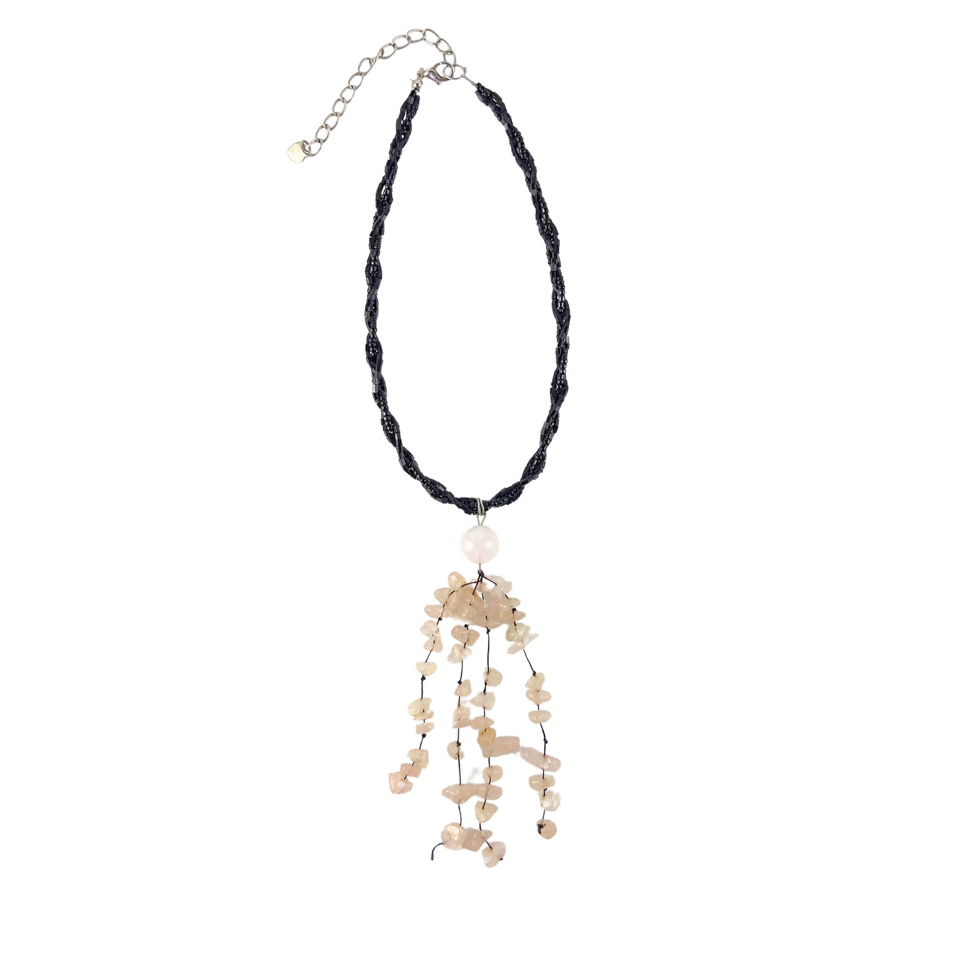 The centerpiece of this necklace lies in the captivating rose quartz beaded tassels that hang gracefully, exuding a playful and enchanting charm. As they gently sway with your movements, they become an alluring focal point, captivating attention and adding a touch of whimsy to your look. 12-15" in length. In great used condition.