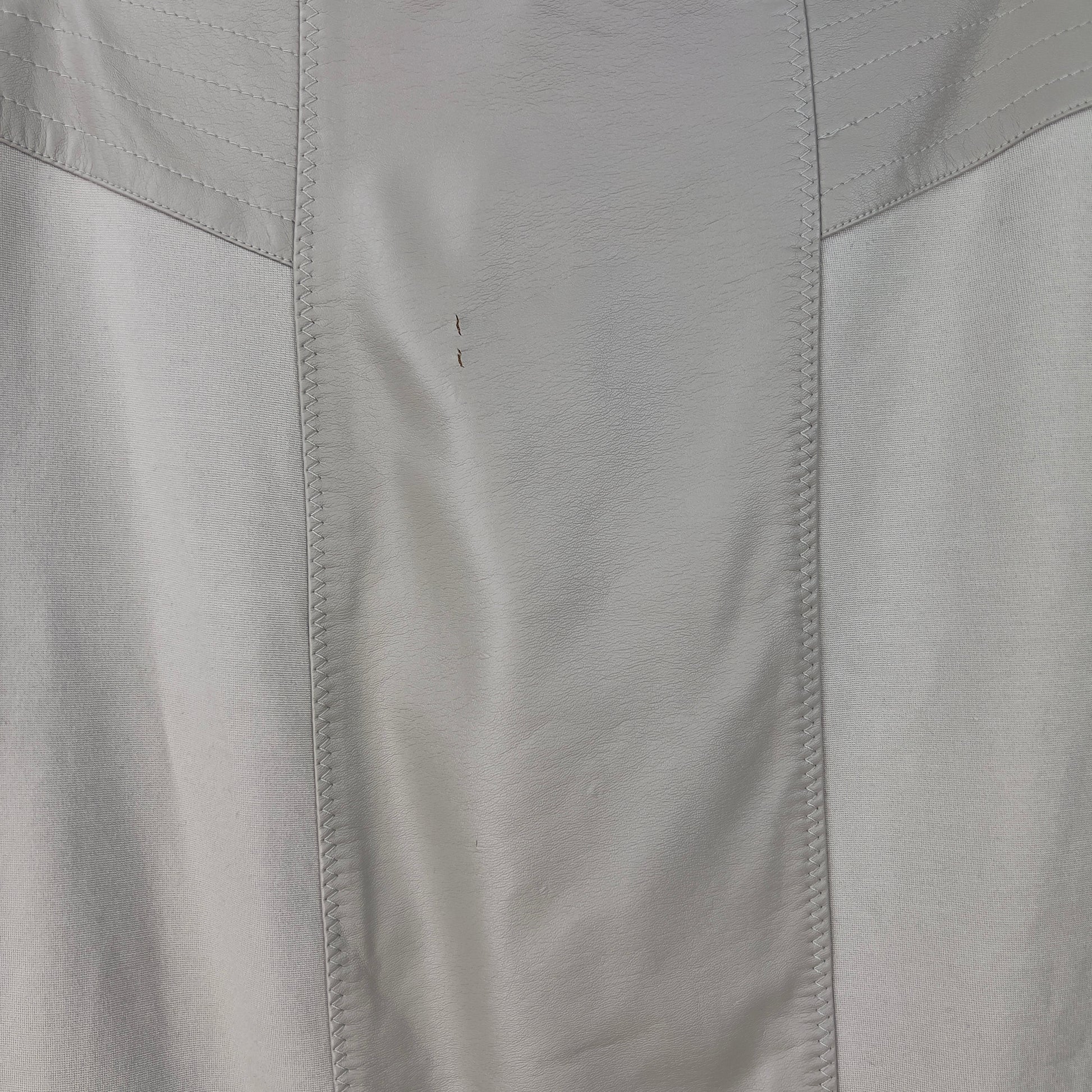 Shiny pleather mixed with matt, stretchy rayon are a good fit for this pencil skirt. Some deterioration in the front panel of the pleather as pictured. Best for BG due to the breakdown. In good used condition. Size 6 fits like a medium. Waist measures 29". Back zip closure.