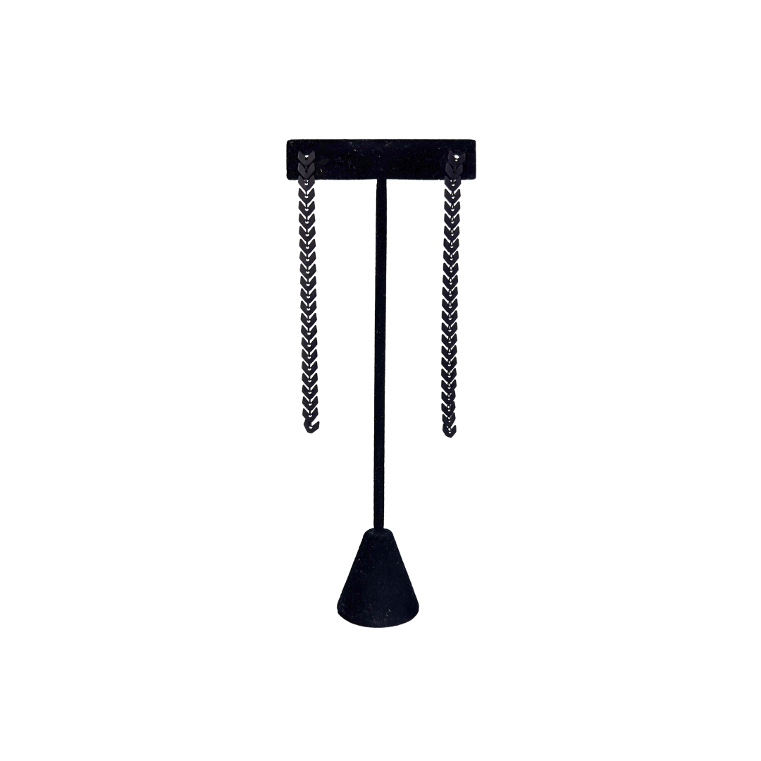 Black herringbone chain dangles 3.5" in length on these earrings. In new condition.