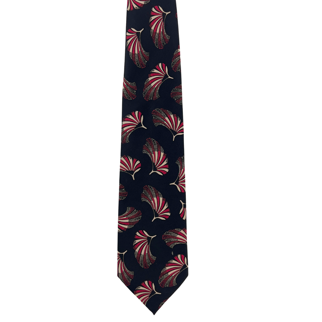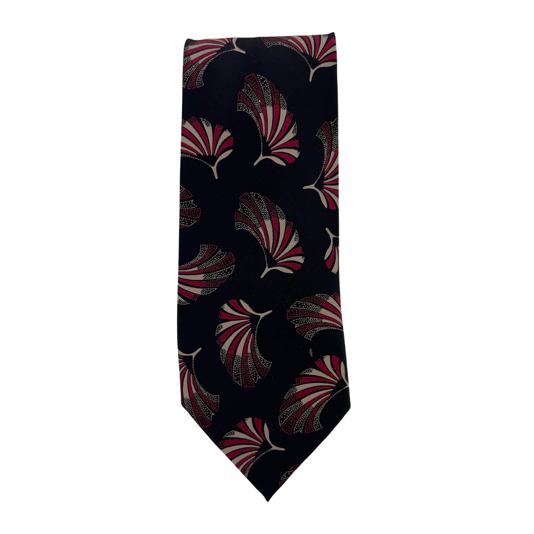 Oscar de la Renta black tie with red and white fan shapes that appear to be in omtion with trails behind them. In excellent vintage condition. 3.75" at it's widest.