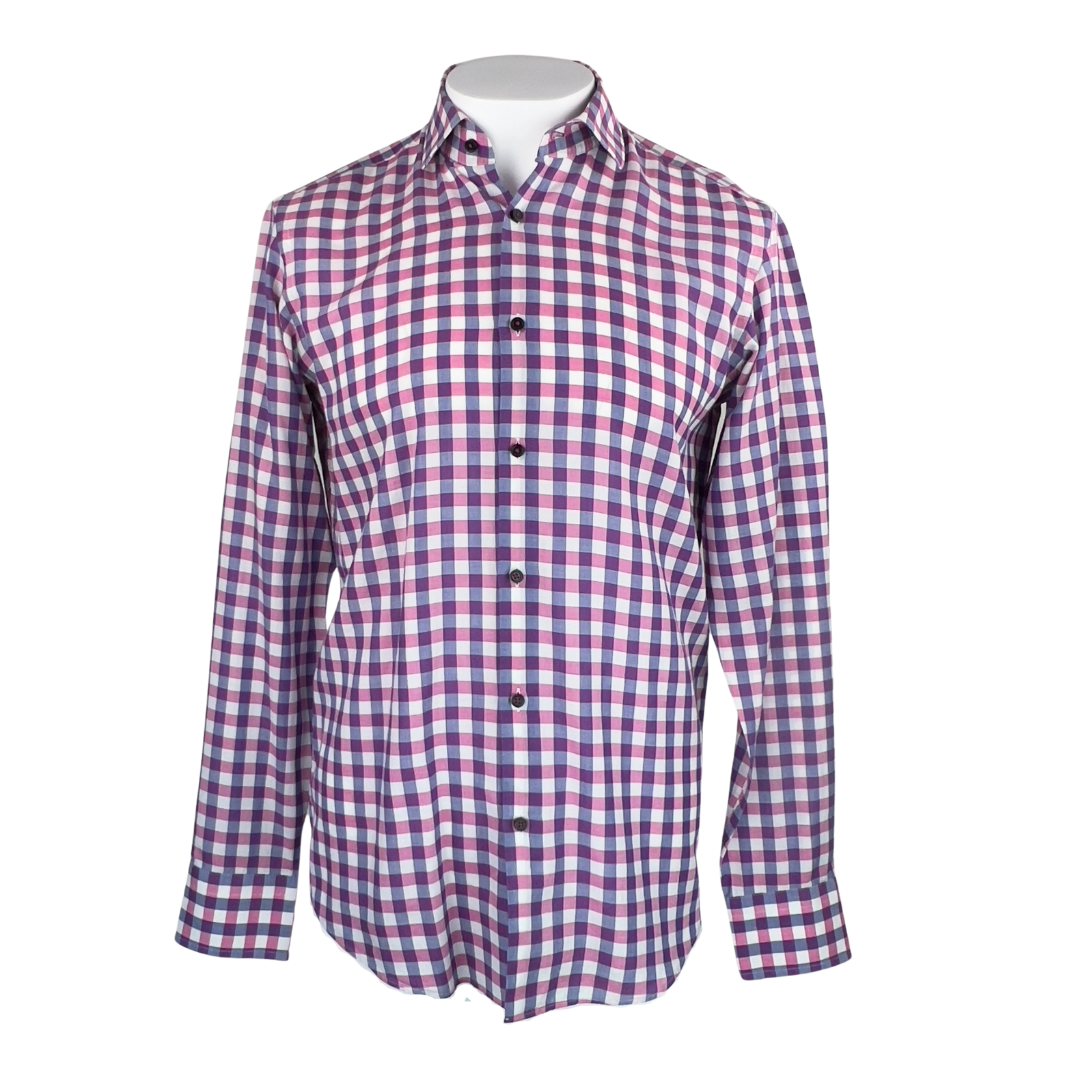 Hugo Boss regular fit dress shirt in pink and navy gingnham. Slight spread collar. In excellent used condition.