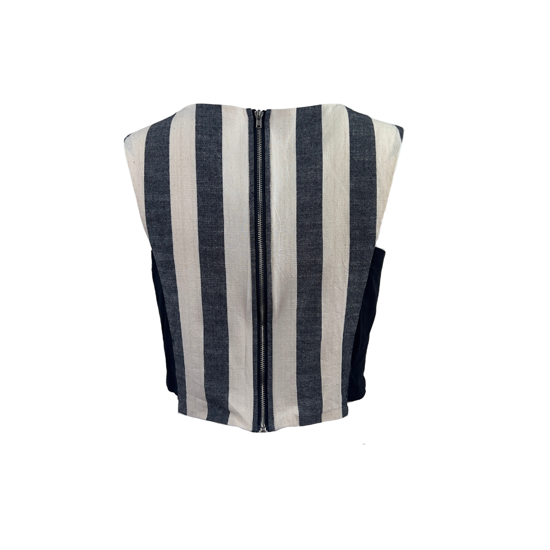 A cute, sleeveless, striped, crop top in beige and black. Zip closure up the back.