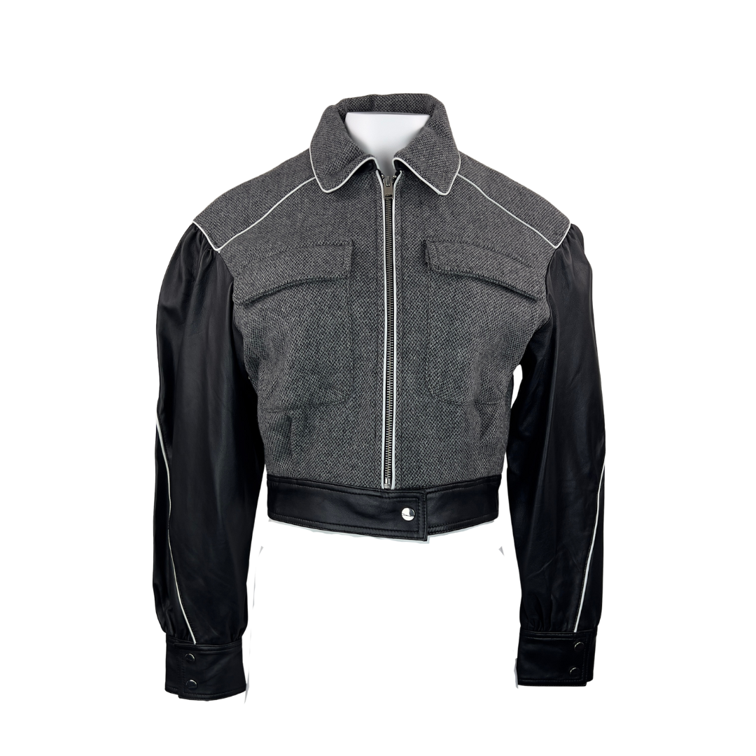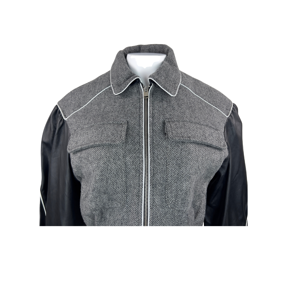 This one is exquisite. Tweed grey bomber jacket with black leather sleeves and white piping details. In new condition. Size small, fully lined. 35% wool. Real leather. Specialty cleaner only.