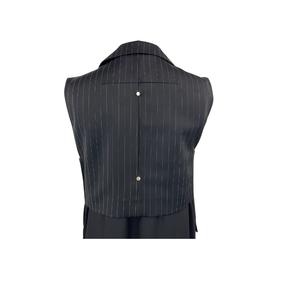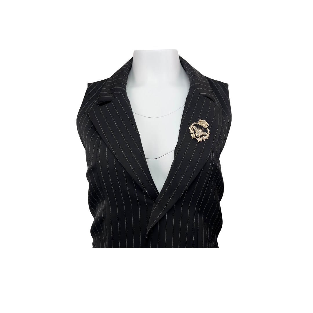 This vest is designed to be worn open with a flowing lapel. You may choose to belt it as well. Silver metal brooch is attached permanently to the vest. In new condition.