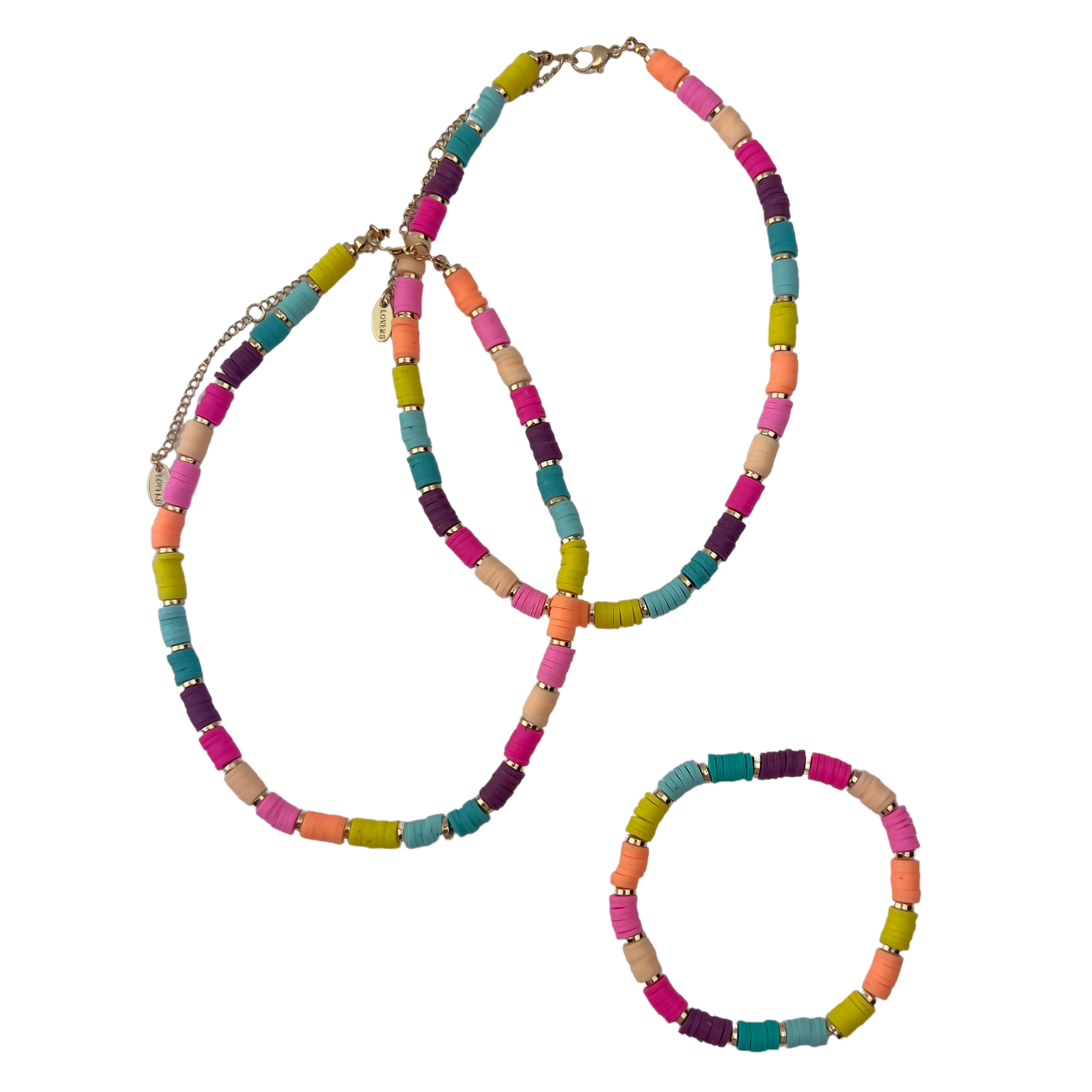 Cute and colorful beaded necklace for your most colorful characters. x2 of Necklace available and one matching bracelet as well. 16-20" in length. In new condition.