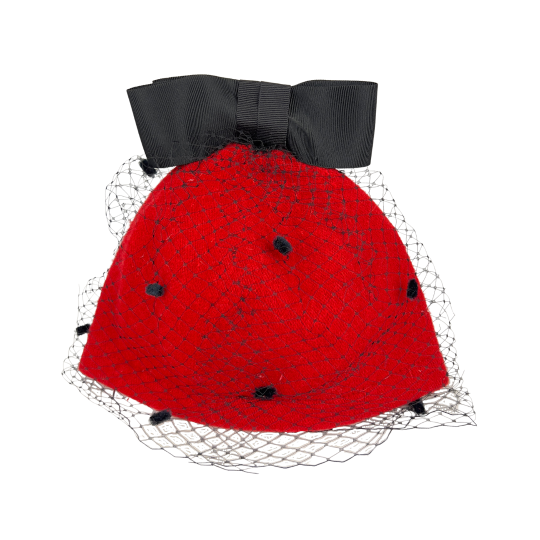 Helene Berman, red toque with black netting and bow on top of crown. Made in Italy. 100% Polyester. In good used condition. Minimal separation in the veil.
