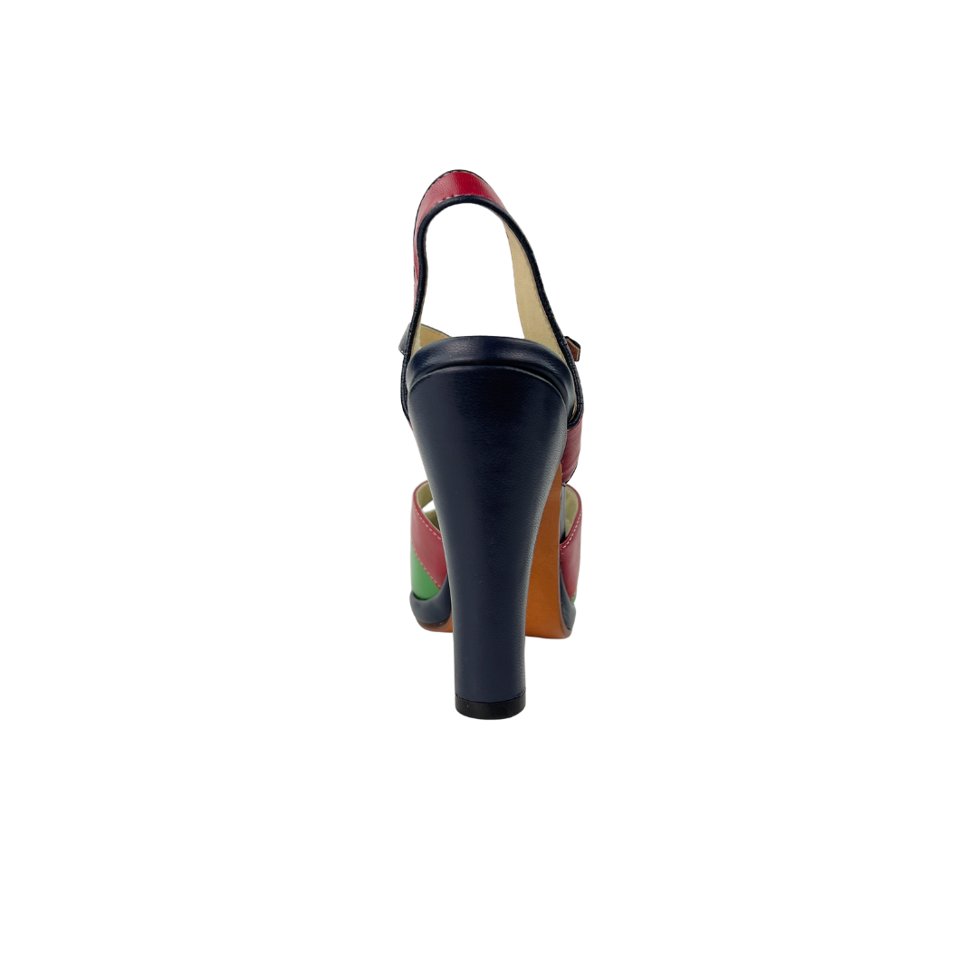 A 1940’s Carmen Miranda inspired platform high heel with cutouts and a peep toe. Color blocked with red, green, yellow and navy. Leather uppers with leather soles. The brand advises that this style runs long and most clients size down a half size to accomodate. 4.5" Heel with 1/2" platform. In new condition.