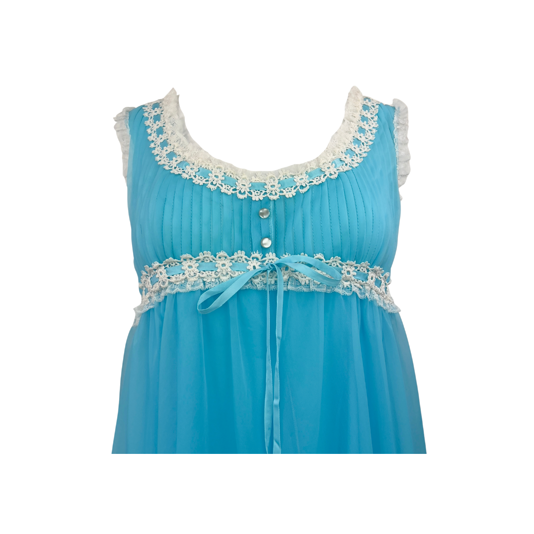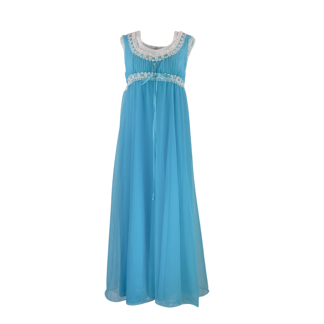 Robin's egg blue, empire waist nightgown from 1970's. Full length and sleeveless. In excellent vintage condition.