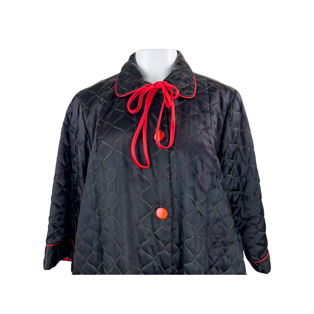 Vintage Black Quilted House Coat with Rainbow Thread and Red Trim