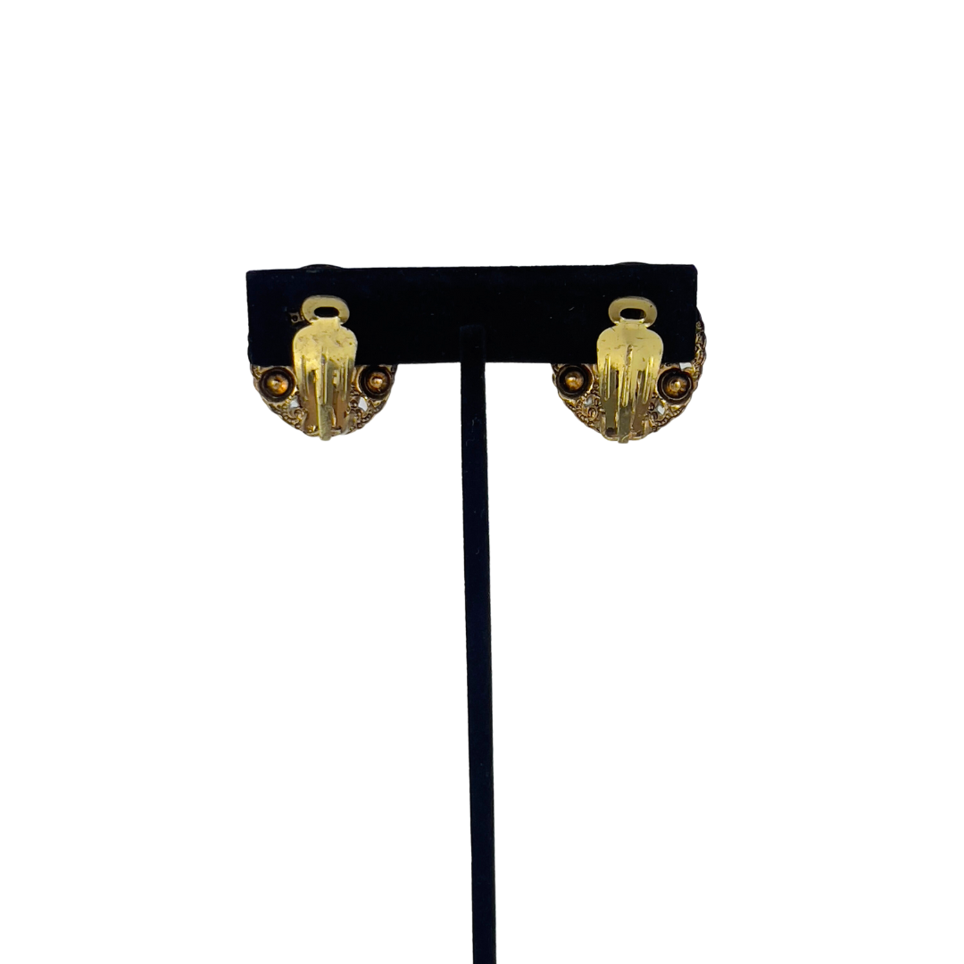 A striking matching set of clip on earrings and brooch. Made of turquoise and brass. Brooch is 1.5 x 2"